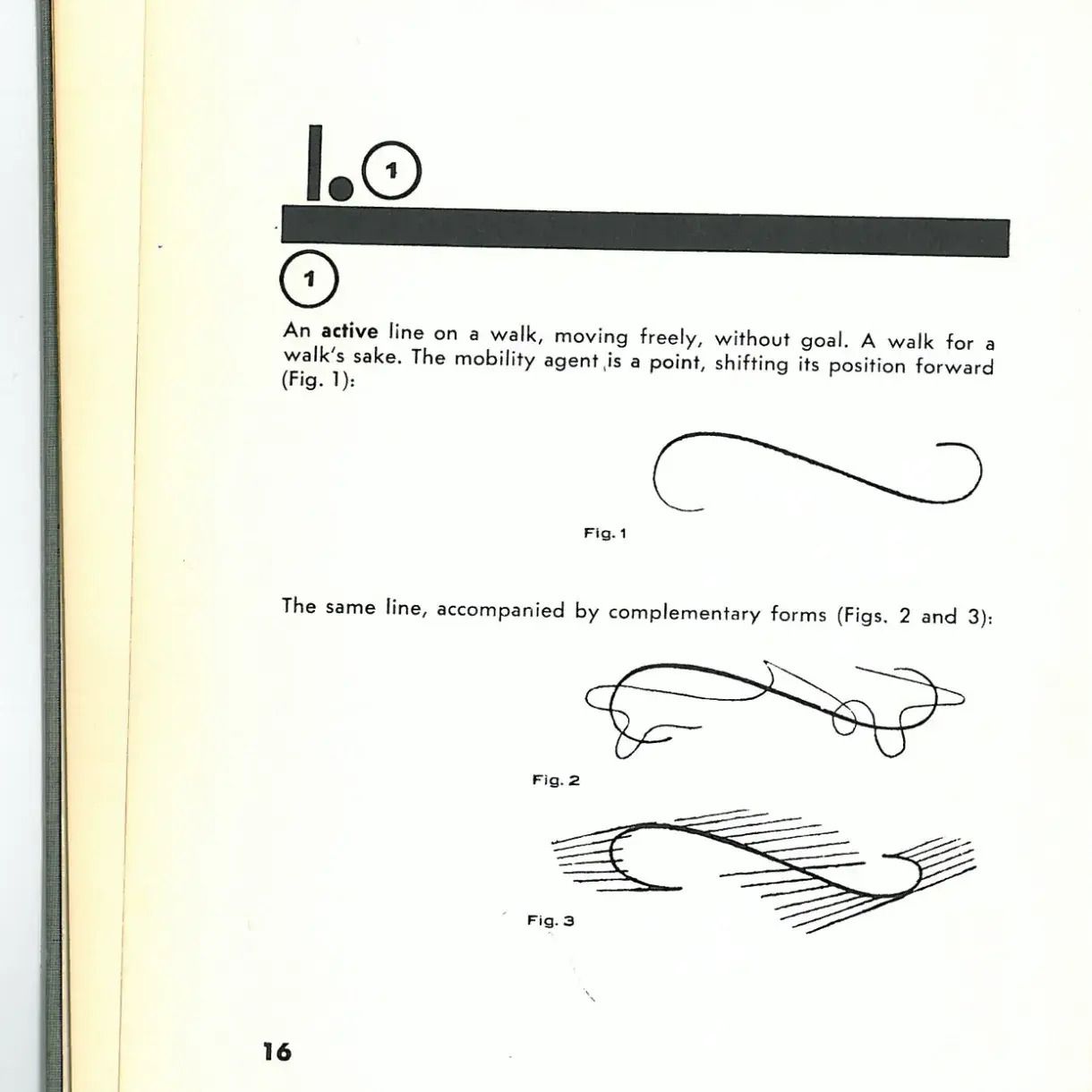 "An active line, moving freely, without goal. A walk for walk's sake. The mobility agent is a point, shifting its position forward."
